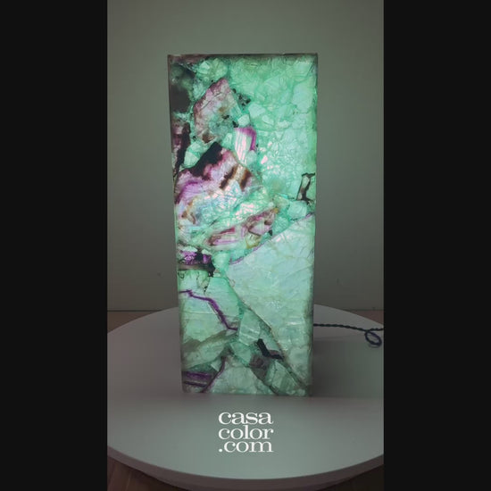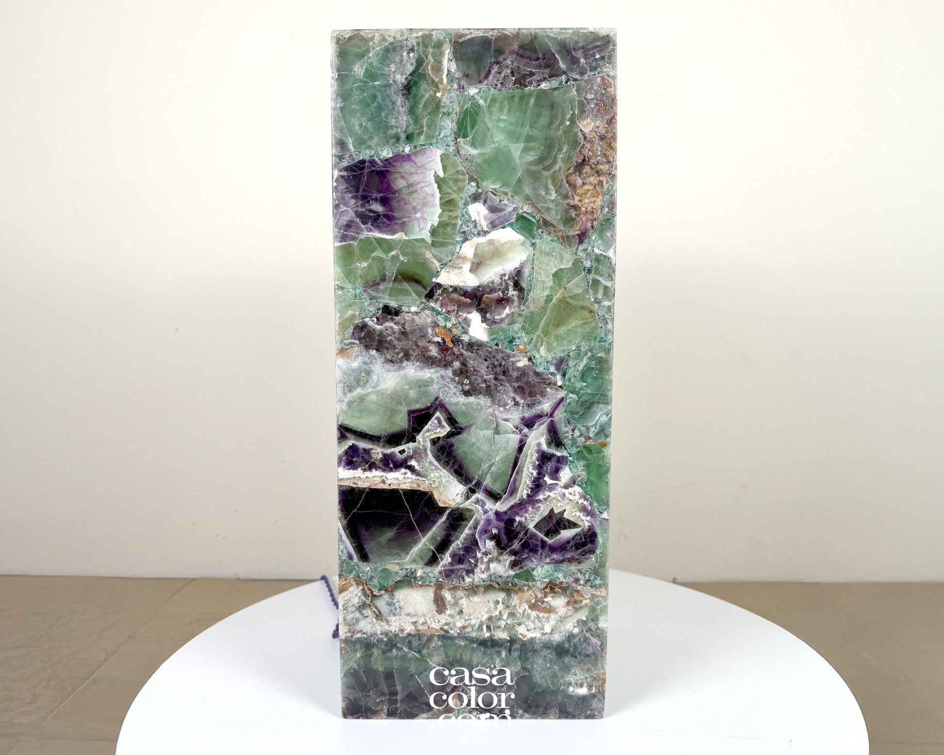 Indulge in the exquisite elegance of this one-of-a-kind Fluorite crystal lamp. Crafted from 100% pure crystal, this lamp radiates high quality and sophistication. The lamp pictured is the exact one you will receive. When illuminated, the translucent properties of Fluorite reveal a mesmerizing galaxy of colors, including purples, greens, browns, and blues, making this lamp a truly luxurious addition to your home.