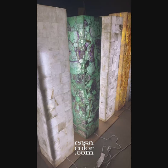 Experience true luxury with our Fluorite Crystal super tall Tower. This exquisite tower boasts a myriad of tones and colors, providing a stunning display of lighting. The formation of Fluorite crystal takes millions of years, making this gem truly remarkable in its size. Each tower is crafted from 100% crystal Fluorite, adding a touch of exclusivity to any space. And as a bonus.