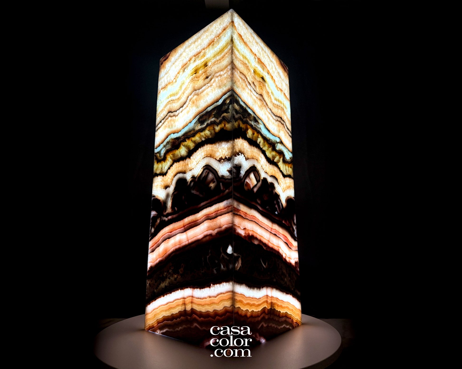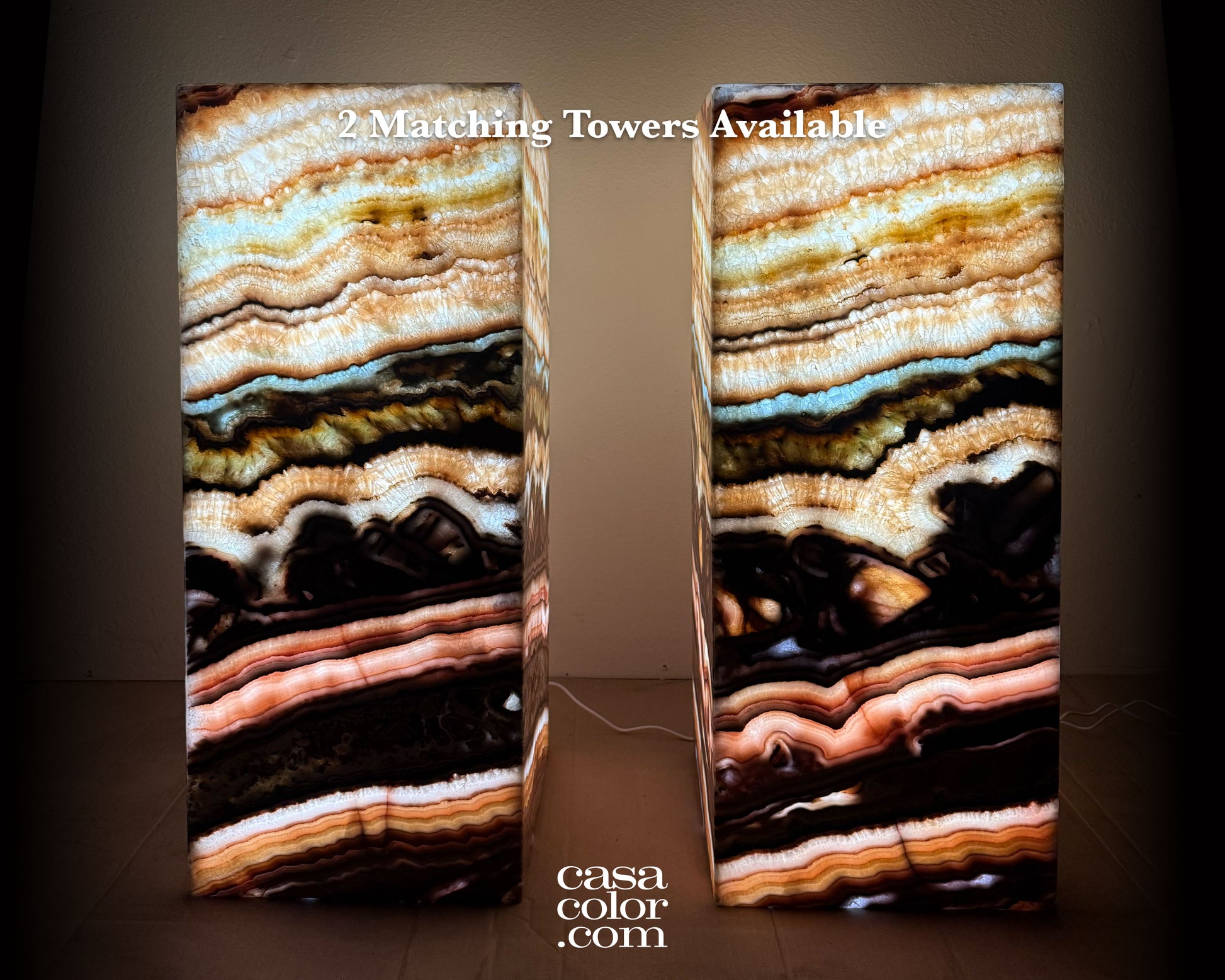 Elevate your space with this magnificent serpentine onyx tower, a rare natural masterpiece born from millions of years of Earth's geological processes. Its aqua tones and distinctive brown veining create an instantly captivating focal point that draws the eye and sparks conversation. Standing at an impressive 31.5" tall and constructed from four expertly joined stone slabs, this tower delivers both visual impact and lasting quality. Whether your style is modern, bohemian, or traditional, these sophisticated natural hues integrate beautifully into any room, transforming your décor with timeless elegance and undeniable presence.