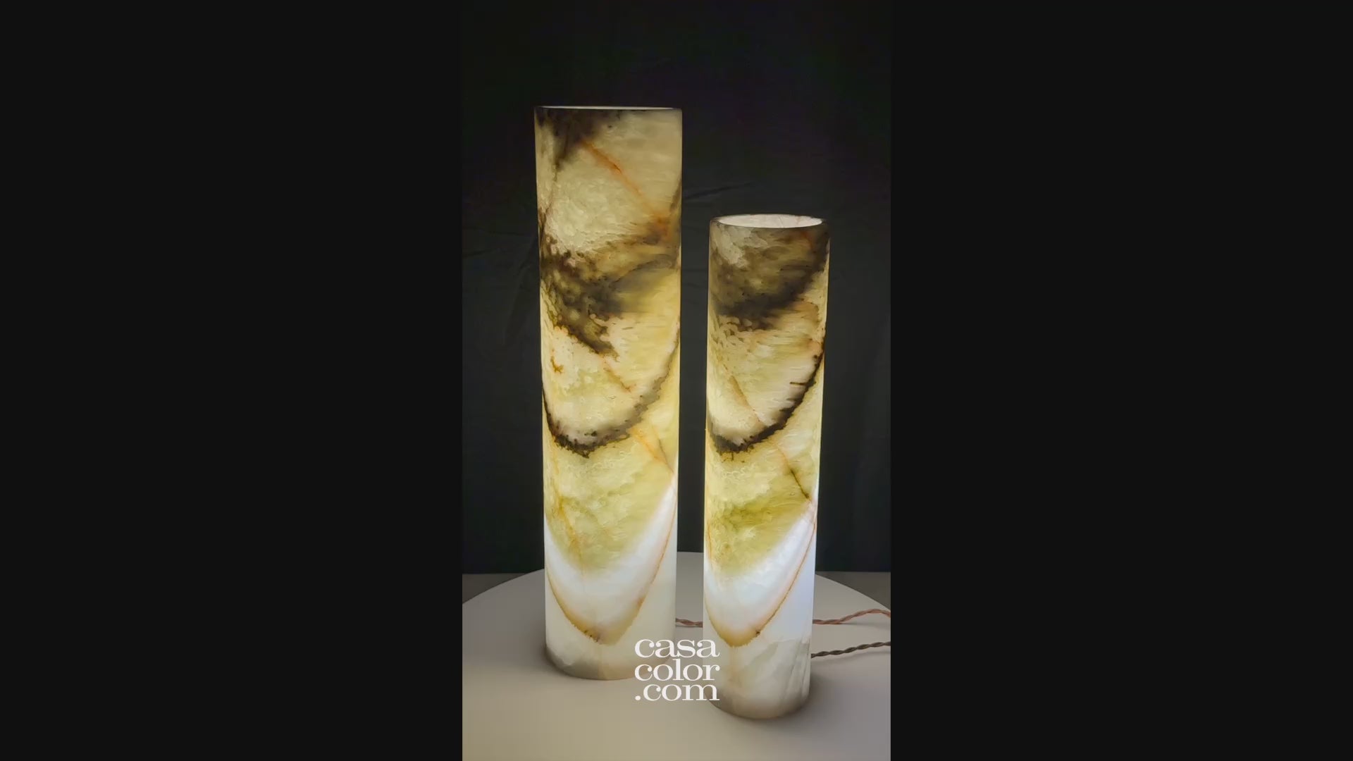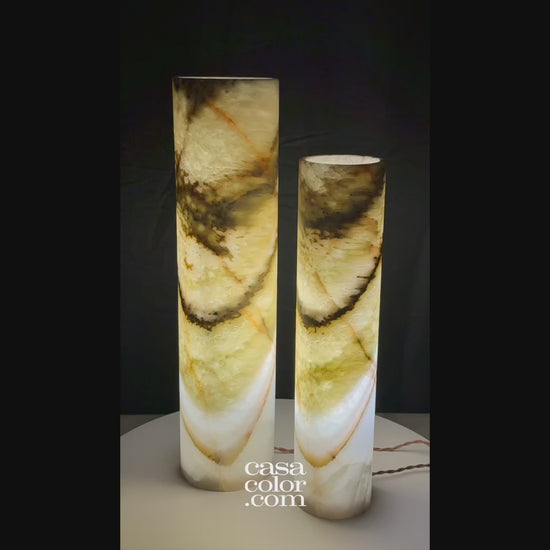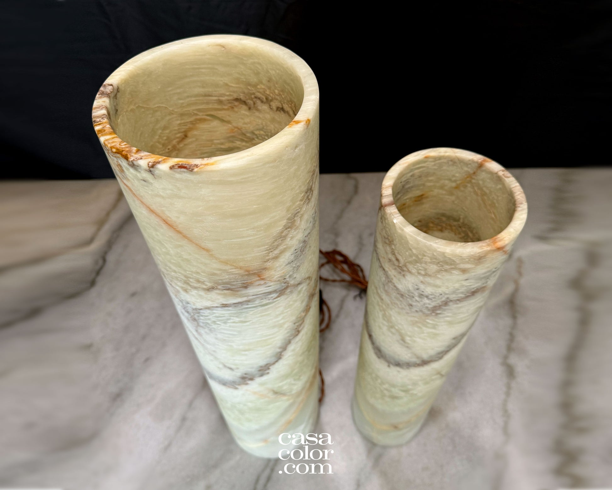 Transform your home with this captivating duo of onyx lamps, where each luminous cylinder is hand-carved from a complete stone block. The translucent light green stone glows beautifully when lit, revealing intricate caramel and beige veining that adds depth and character. These versatile pieces adapt effortlessly to any décor style, making them the perfect choice for those seeking natural beauty with universal appeal.