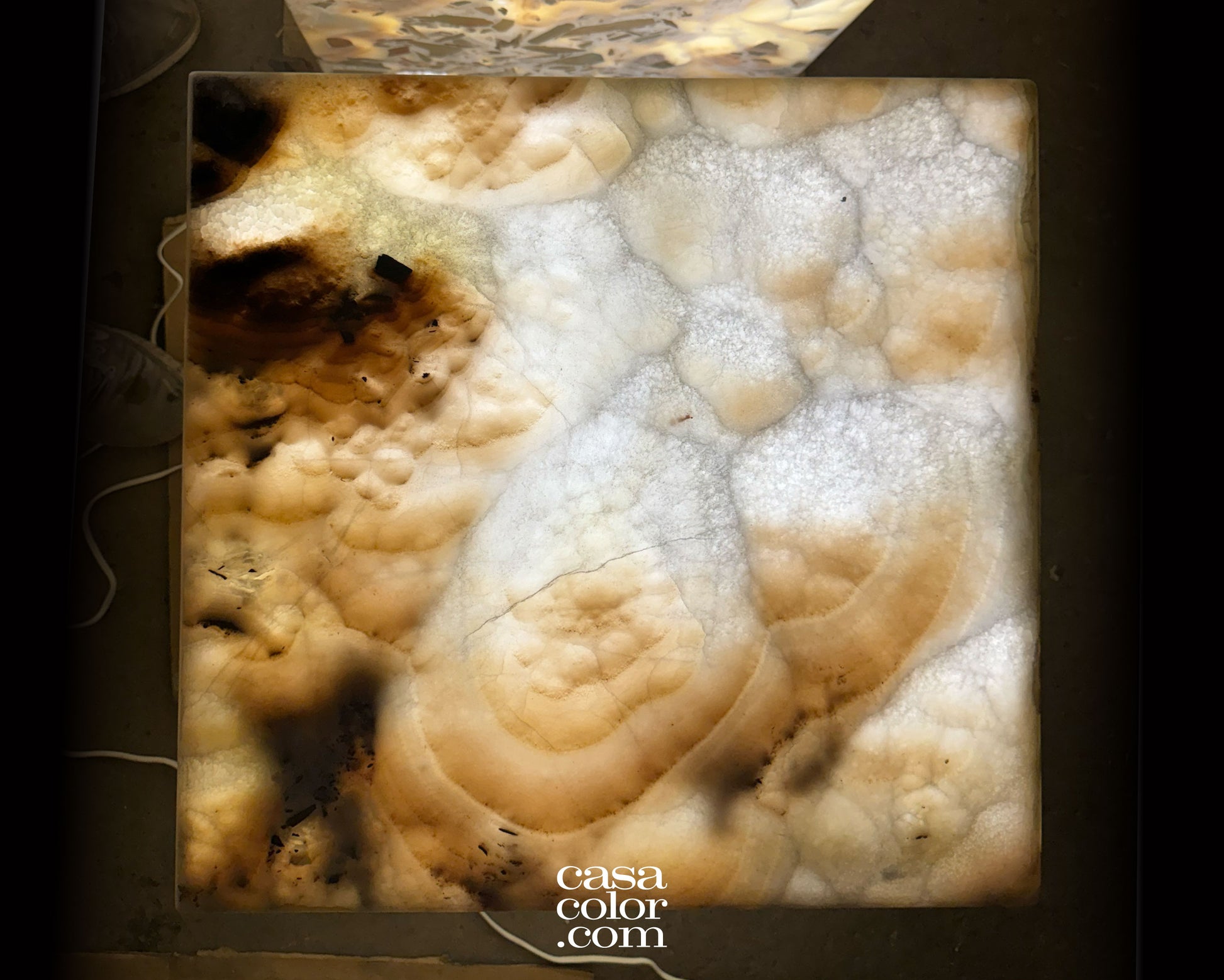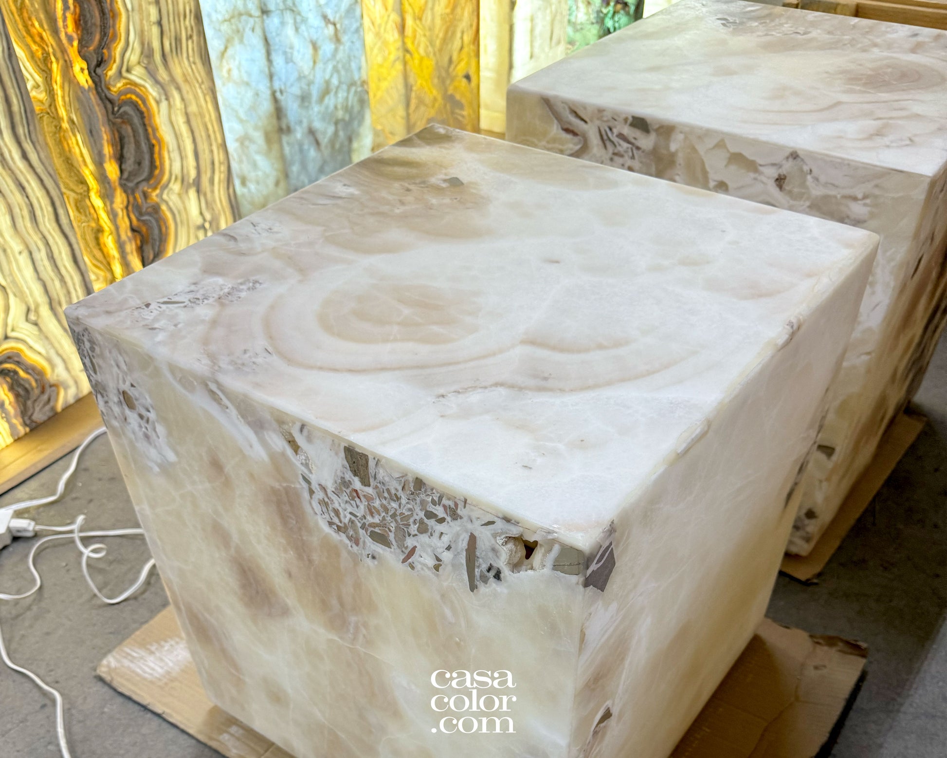 Elevate your living room with this stunning pair of backlit onyx coffee tables that seamlessly complement any interior style. Crafted from four premium slabs of ice onyx stone, each table showcases rich white and caramel tones that add warmth and sophistication to your space. The luminous backlit feature creates an inviting ambiance while the natural stone construction ensures lasting elegance. Whether your décor leans modern, traditional, or eclectic, these versatile tables deliver both visual impact and functional beauty.