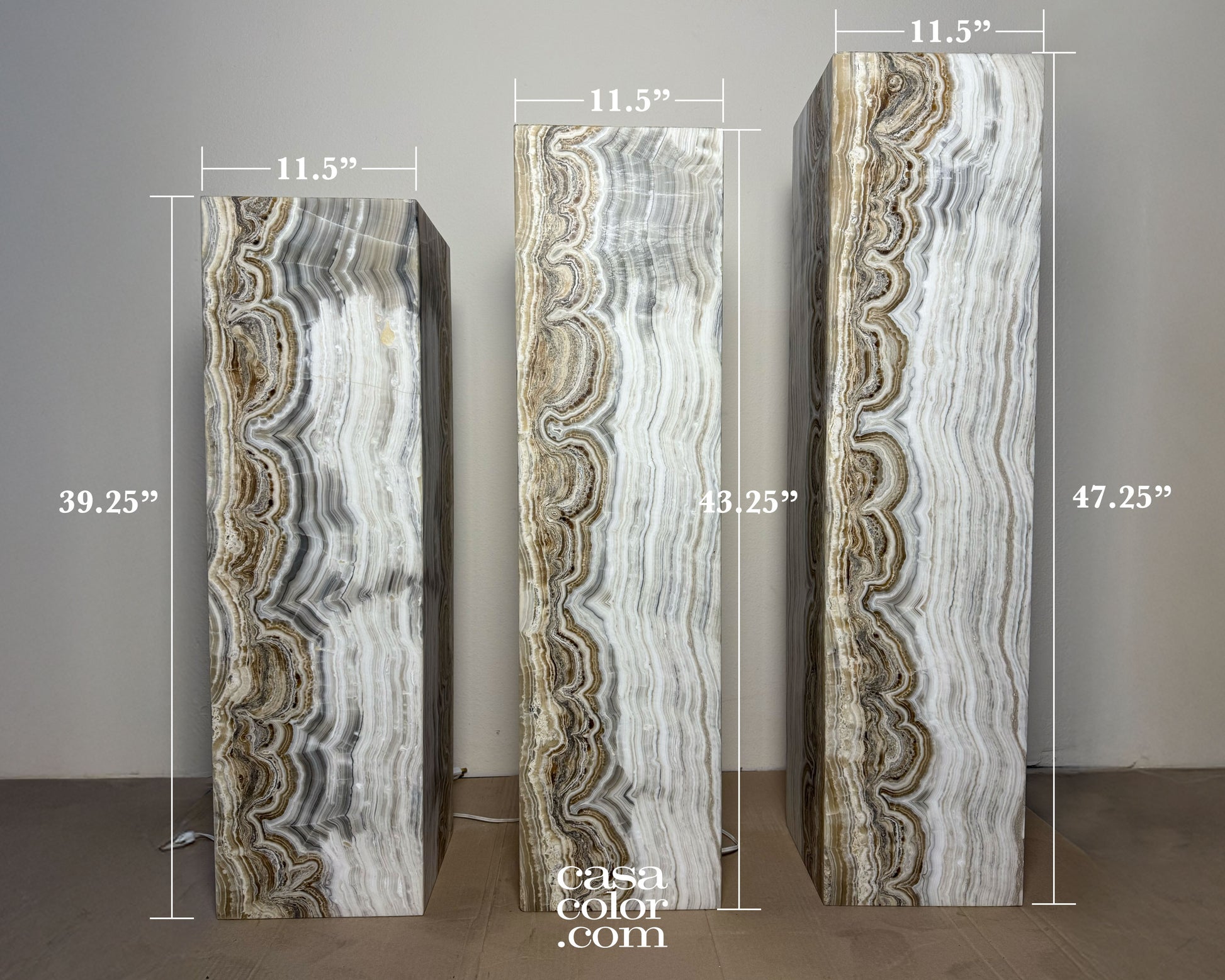 A striking set of three onyx towers with distinctive veining and fiery coloring. Each piece showcases natural patterns that add elegance and visual interest to any space. Perfect for collectors seeking refined, conversation-starting décor.