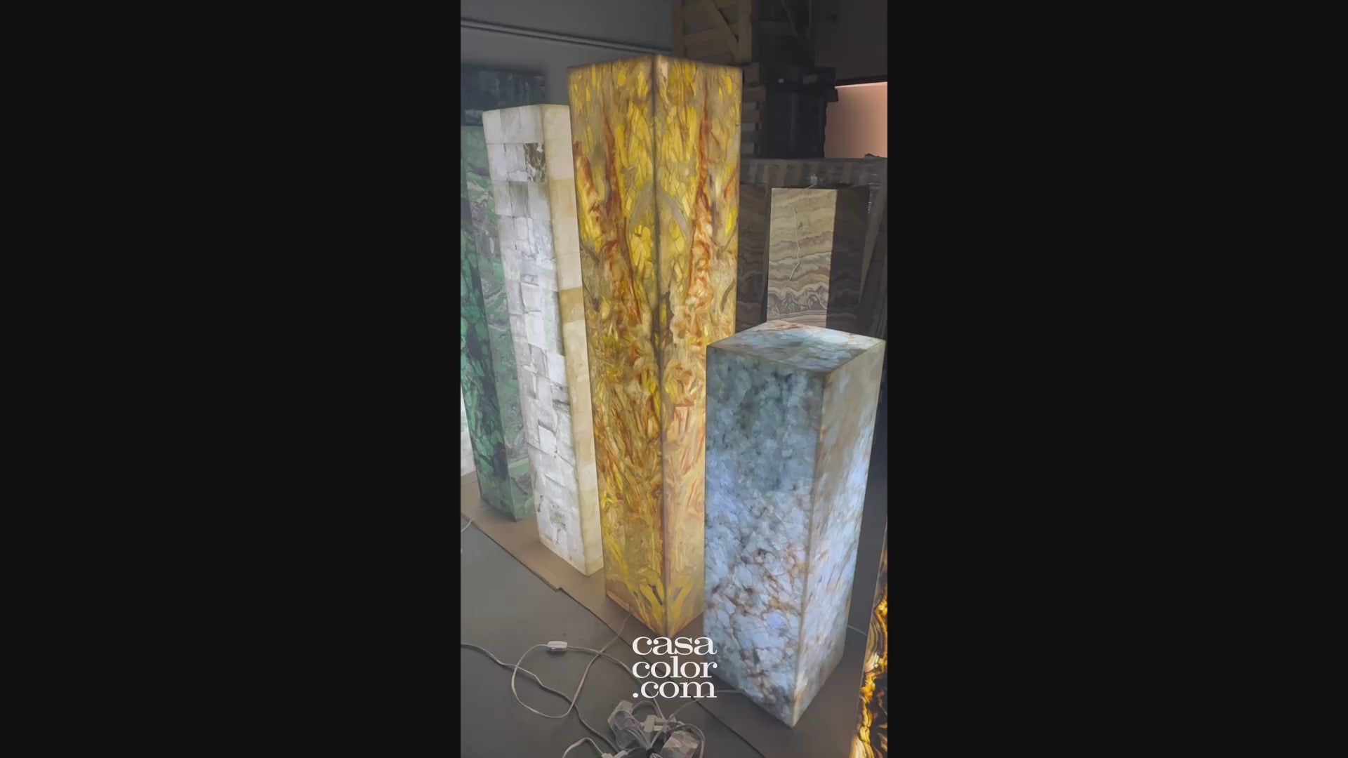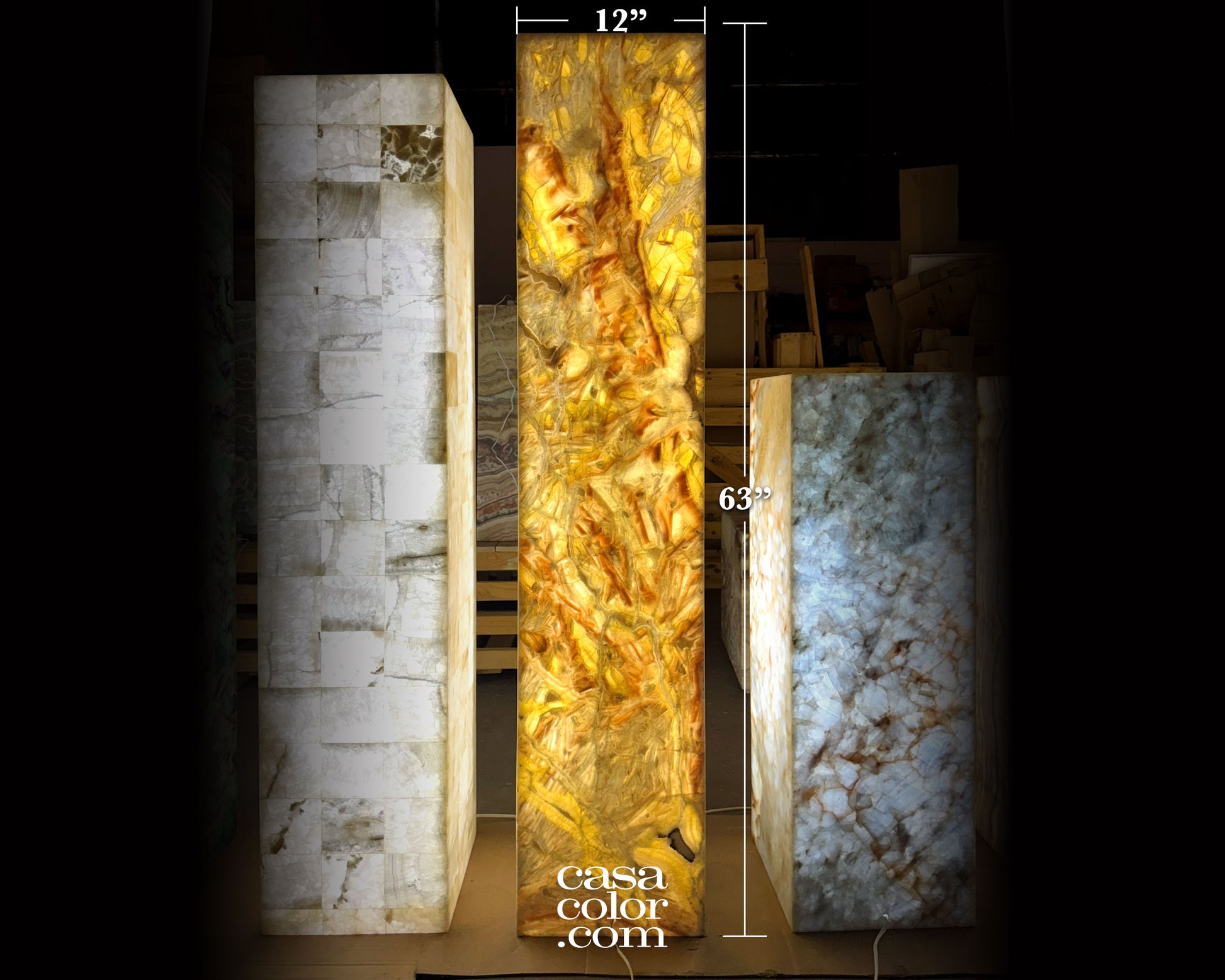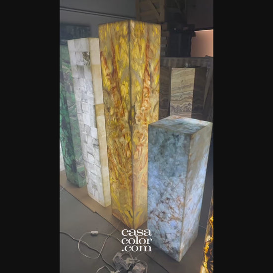 Elevate your space with this magnificent golden onyx tower, a rare natural masterpiece born from millions of years of Earth's geological processes. Its golden tones create an instantly captivating focal point that draws the eye and sparks conversation. Standing at an impressive 63" tall and constructed from four expertly joined stone slabs, this tower delivers both visual impact and lasting quality. Whether your style is modern, bohemian, or traditional, these sophisticated natural hues integrate beautifully into any room, transforming your décor with timeless elegance and undeniable presence.
