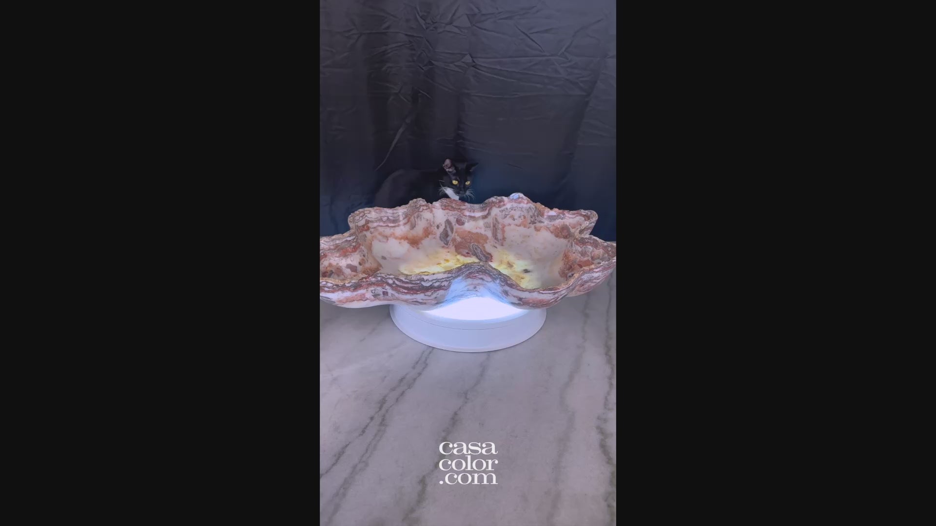 This Onyx Bowl, measuring 31`.5", is a one-of-a-kind masterpiece of natural art. Its unique matte surface and stunning caramel veins are the result of millions of years of formation. Onyx boasts a wide variety of textures, colors, and surfaces, and this particular piece showcases a beautiful natural matte surface with white bottom and beige veins. This is a huge 31.5" one-piece onyx stone carved into a bowl.Â