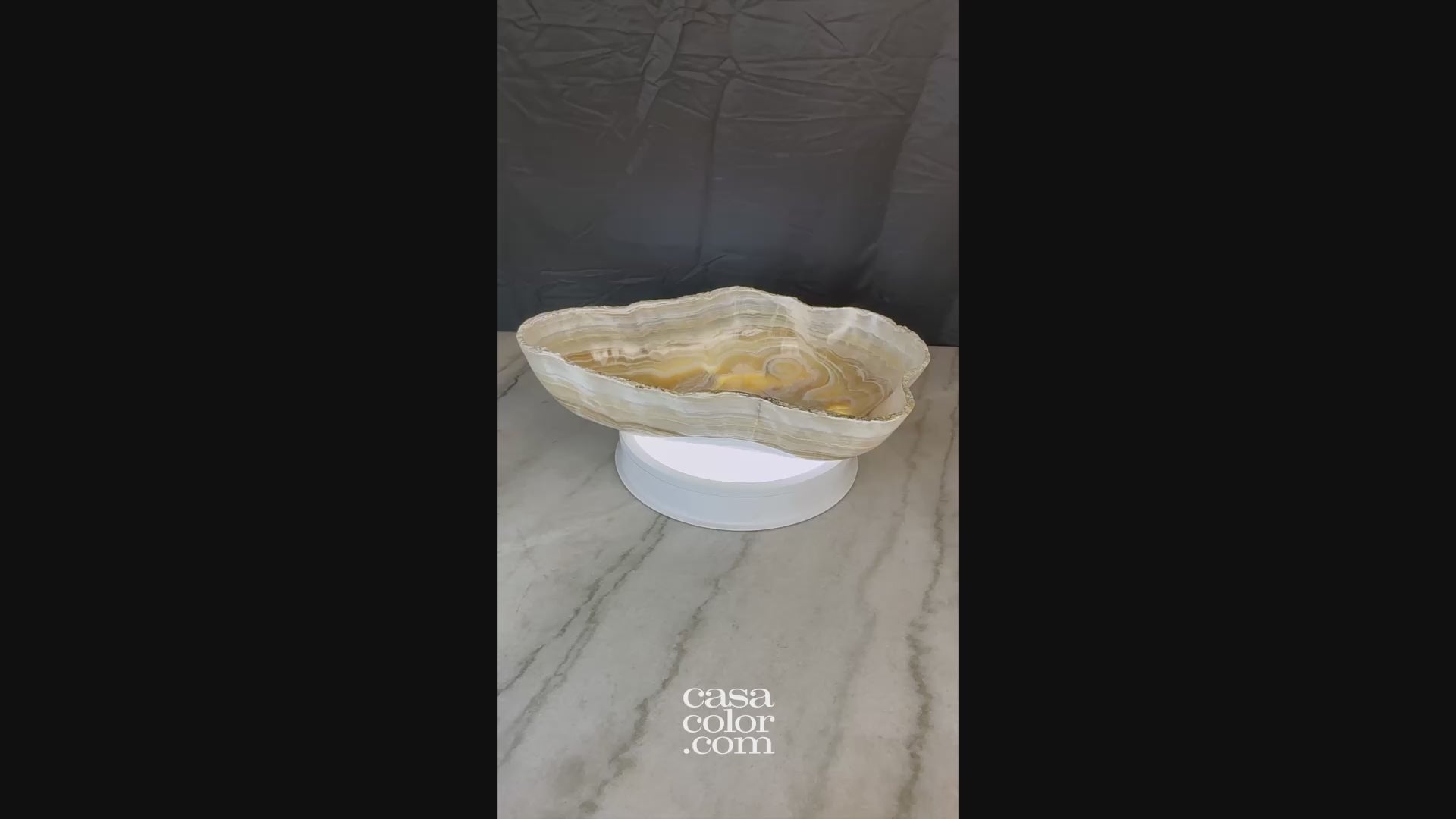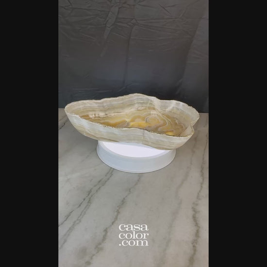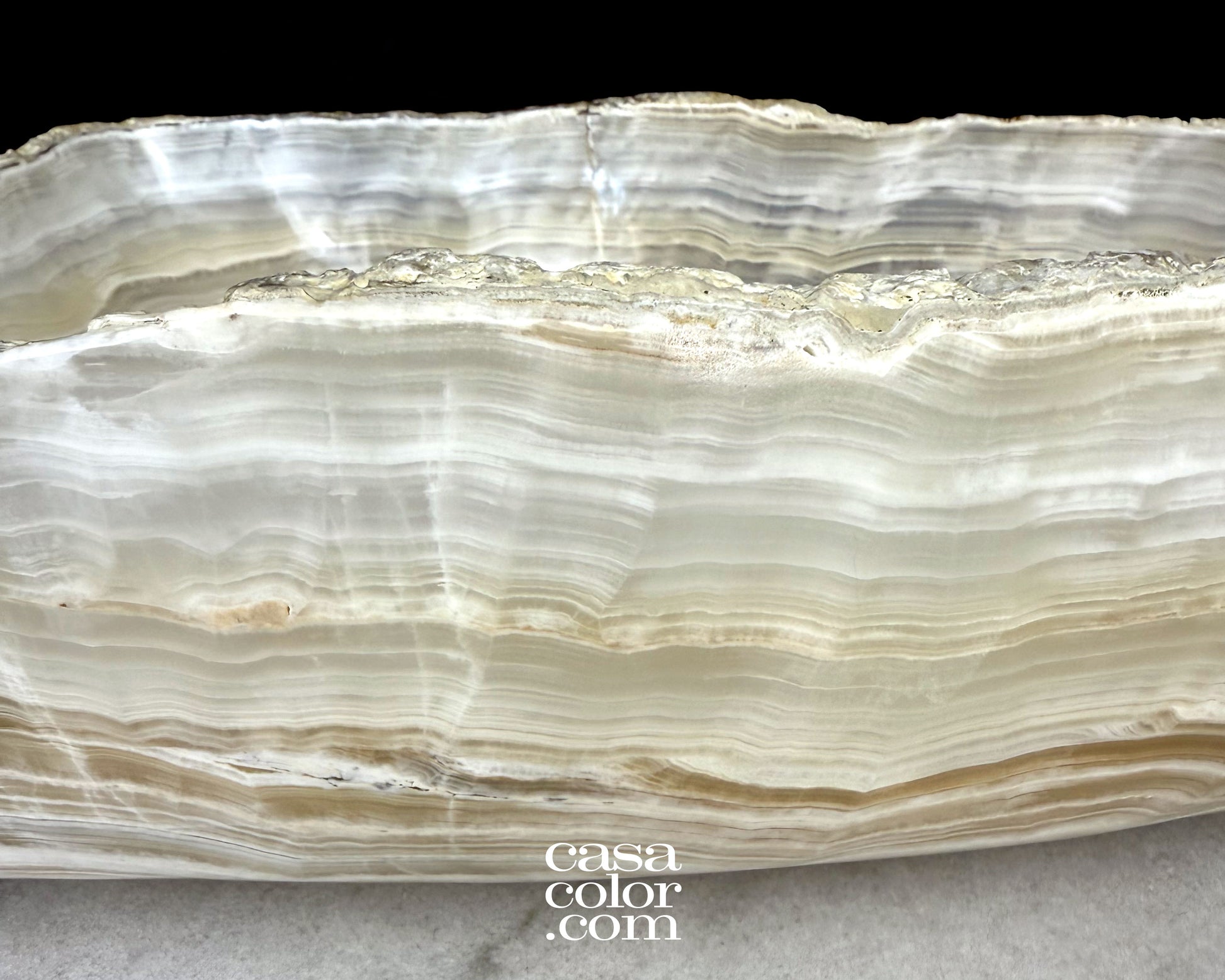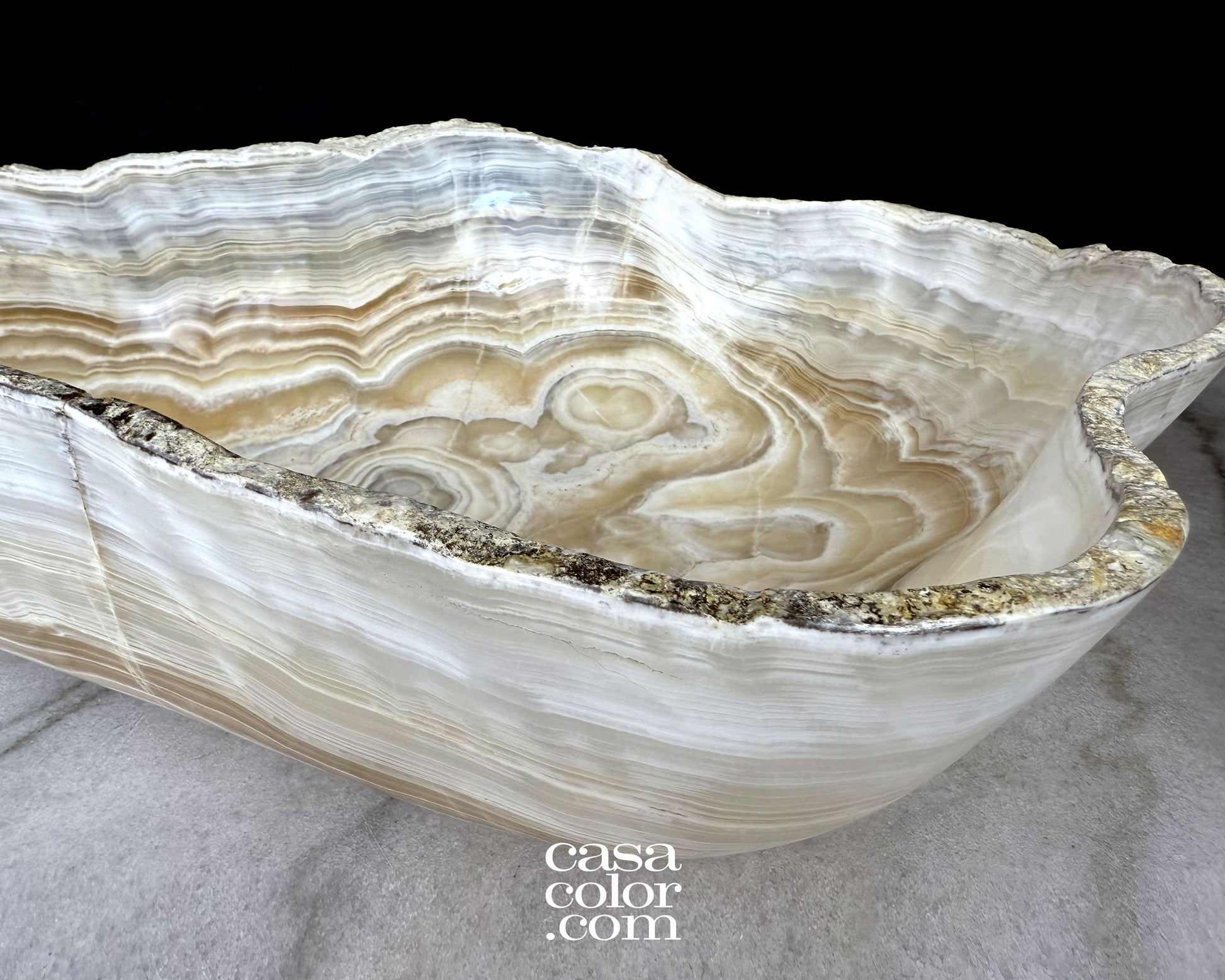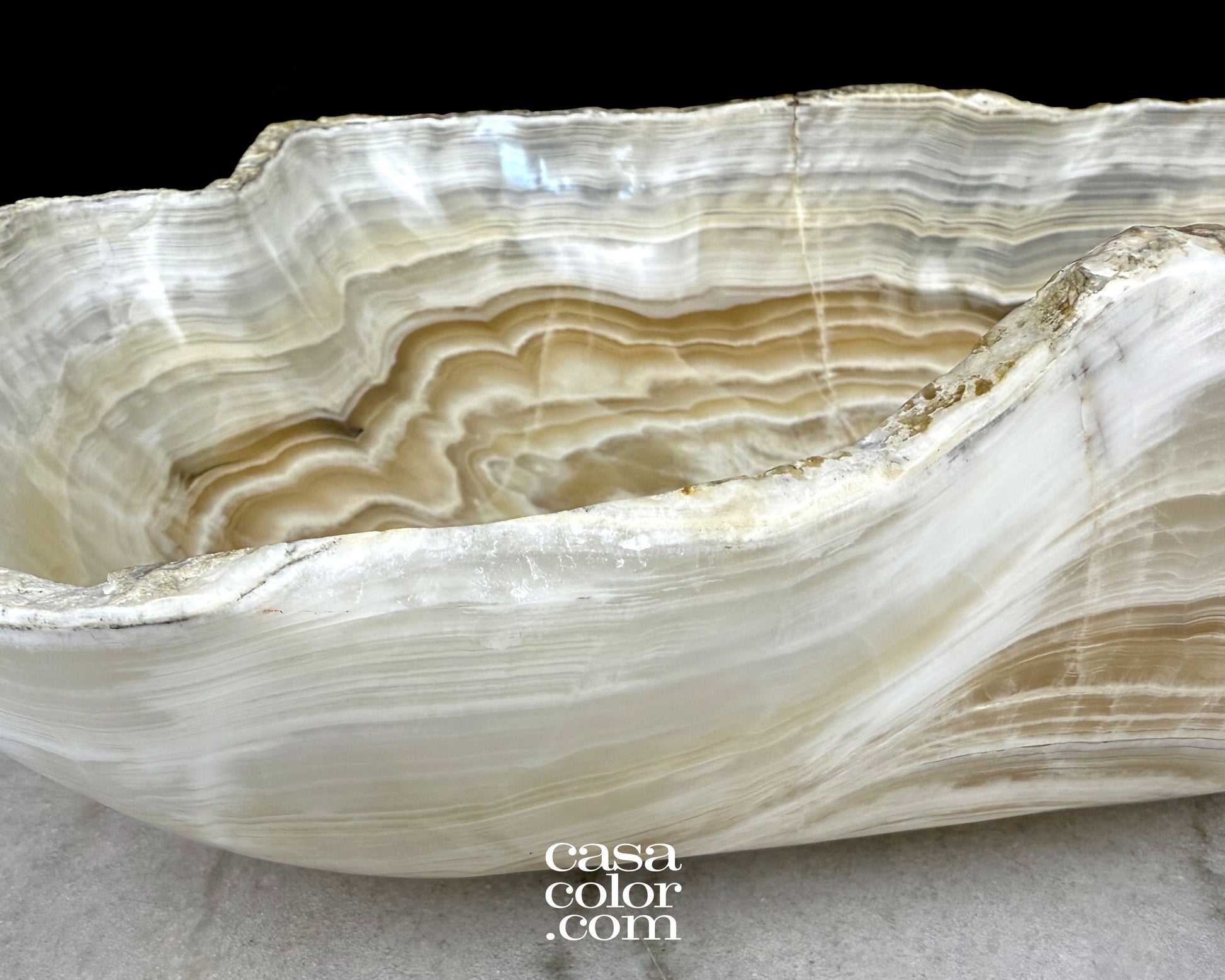 This Onyx bowl, measuring 26", is a one-of-a-kind masterpiece of natural art. Its unique white surfaces and stunning caramel veins are the result of millions of years of formation. Nacar Onyx is the highest quality of onyx, this particular piece showcases a beautiful natural lightly high polished surface with white and beige betas. This is a huge 26" one-single piece of onyx stone carved into a bowl.Â