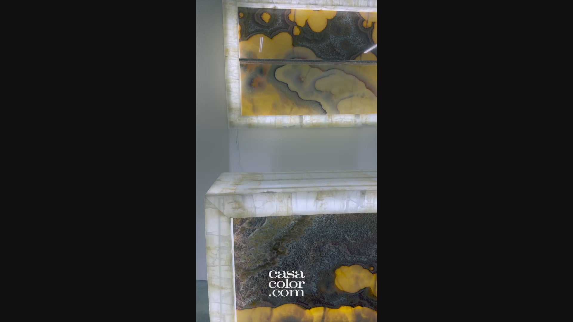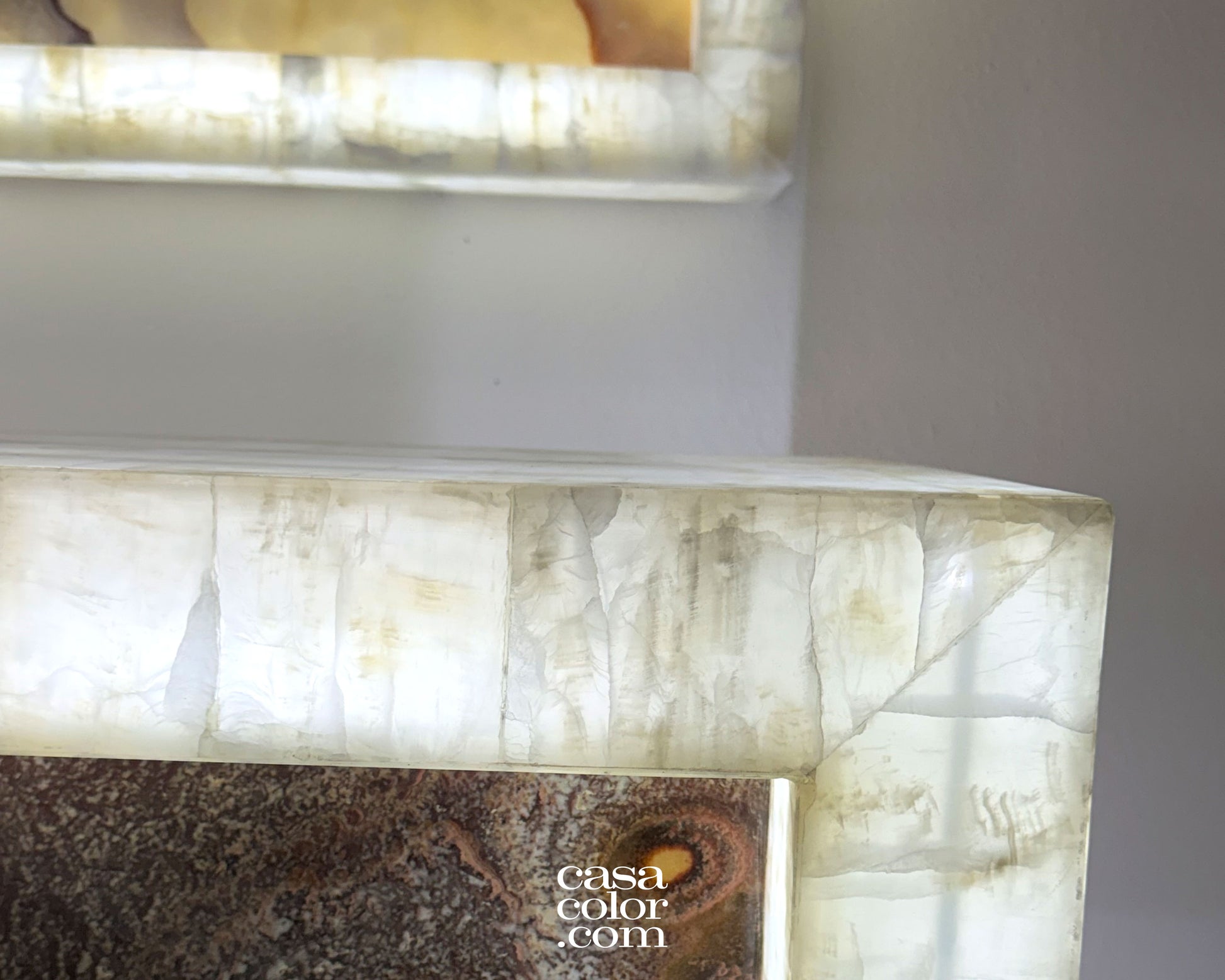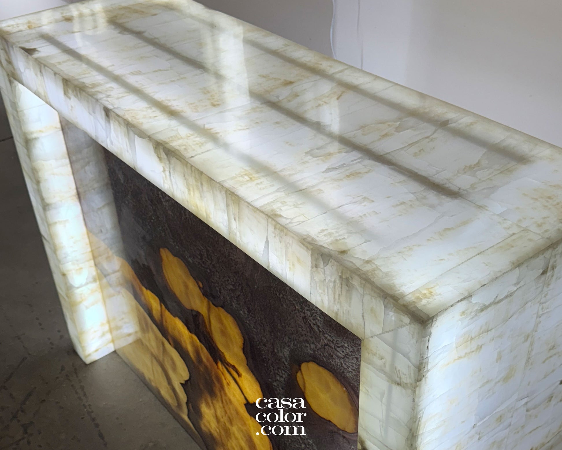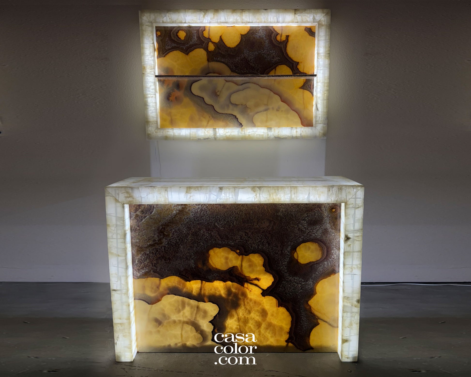 This exquisite LED translucent Vegas-style bar set features a distinctive backlit Onyx design that transforms any environment. Crafted from single slabs of robust onyx with a polished white glossy top, its rich reddish-brown and yellow hues offer a refined aesthetic. Unlike our other bars, this piece stands out for its strength and elegance, making it a captivating centerpiece suited to elevate any home décor style. Prepare to captivate your guests with this exceptional and unique bar.