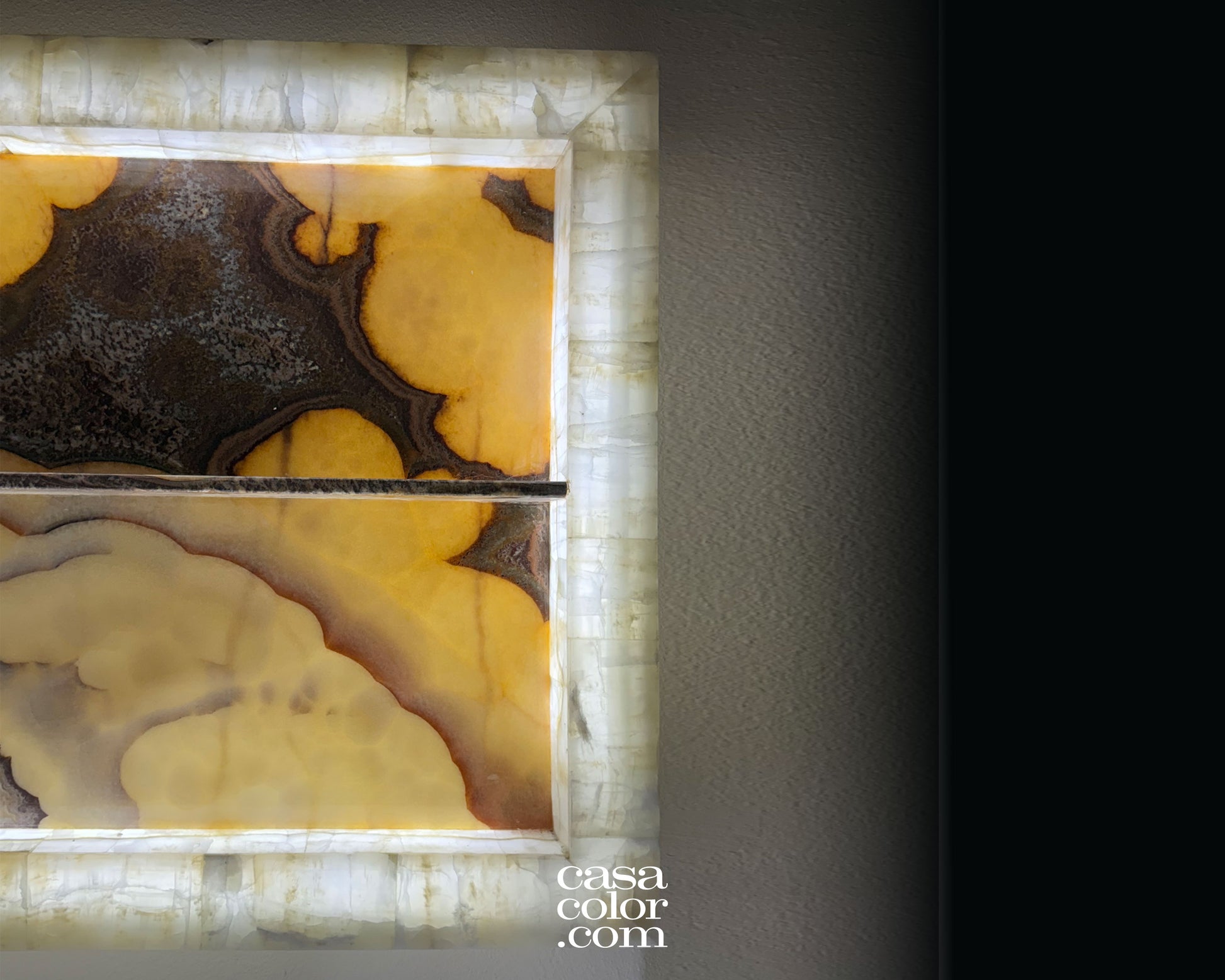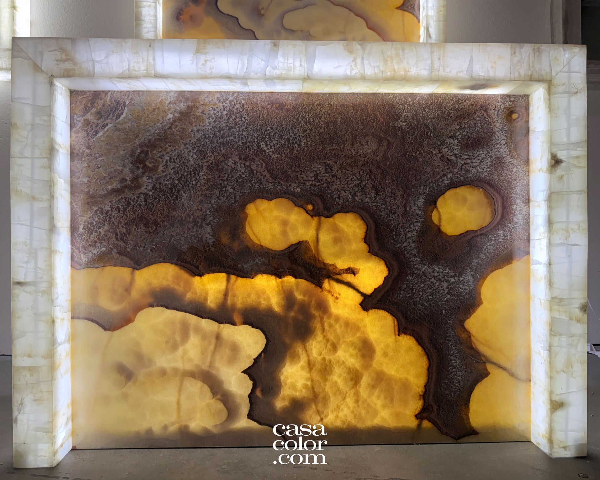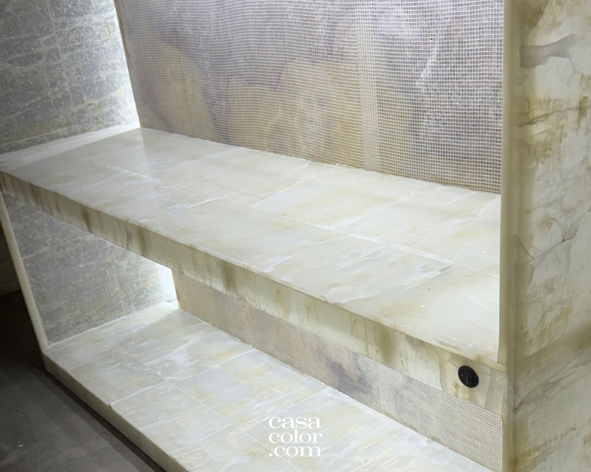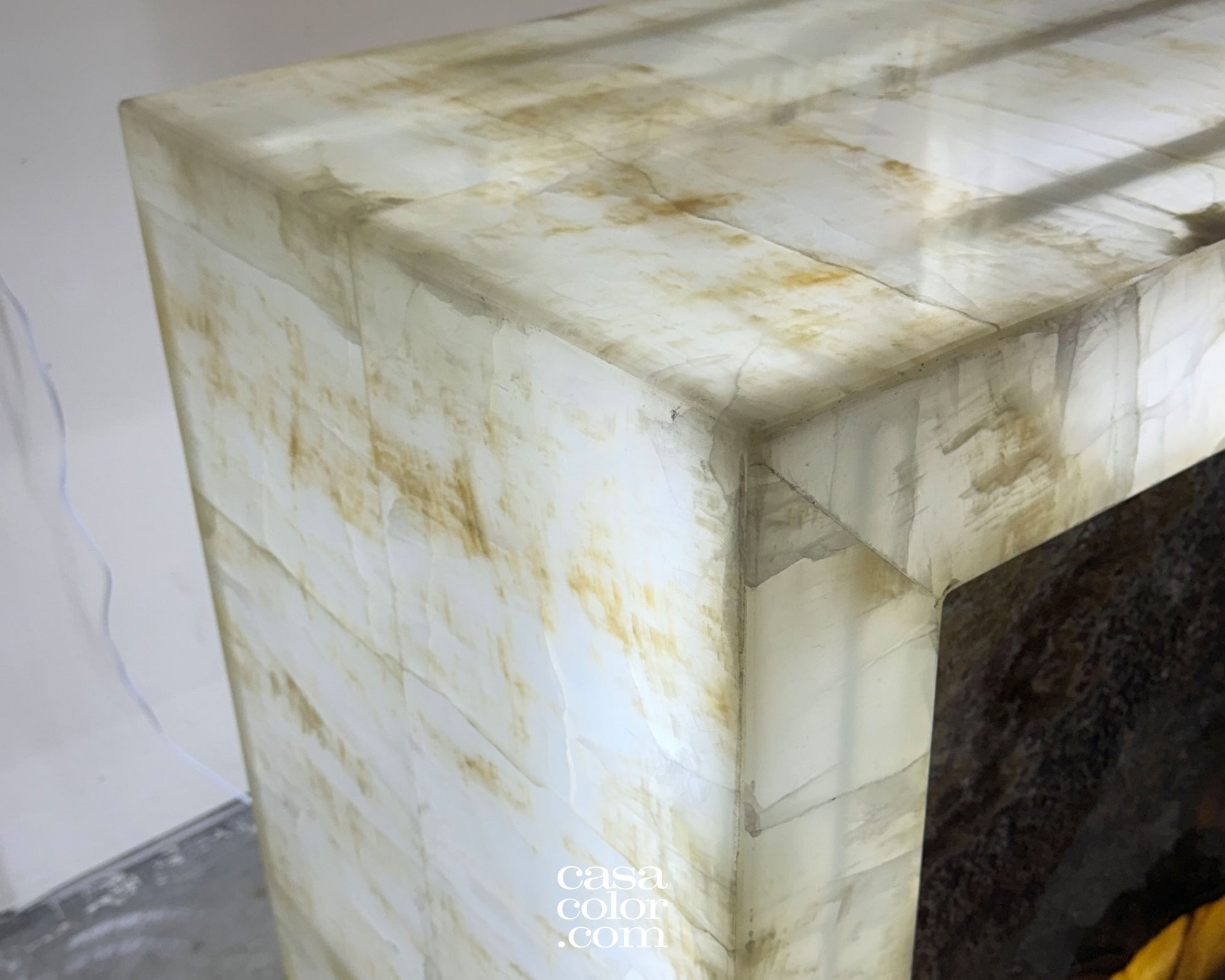 This exquisite LED translucent Vegas-style bar set features a distinctive backlit Onyx design that transforms any environment. Crafted from single slabs of robust onyx with a polished white glossy top, its rich reddish-brown and yellow hues offer a refined aesthetic. Unlike our other bars, this piece stands out for its strength and elegance, making it a captivating centerpiece suited to elevate any home décor style. Prepare to captivate your guests with this exceptional and unique bar.