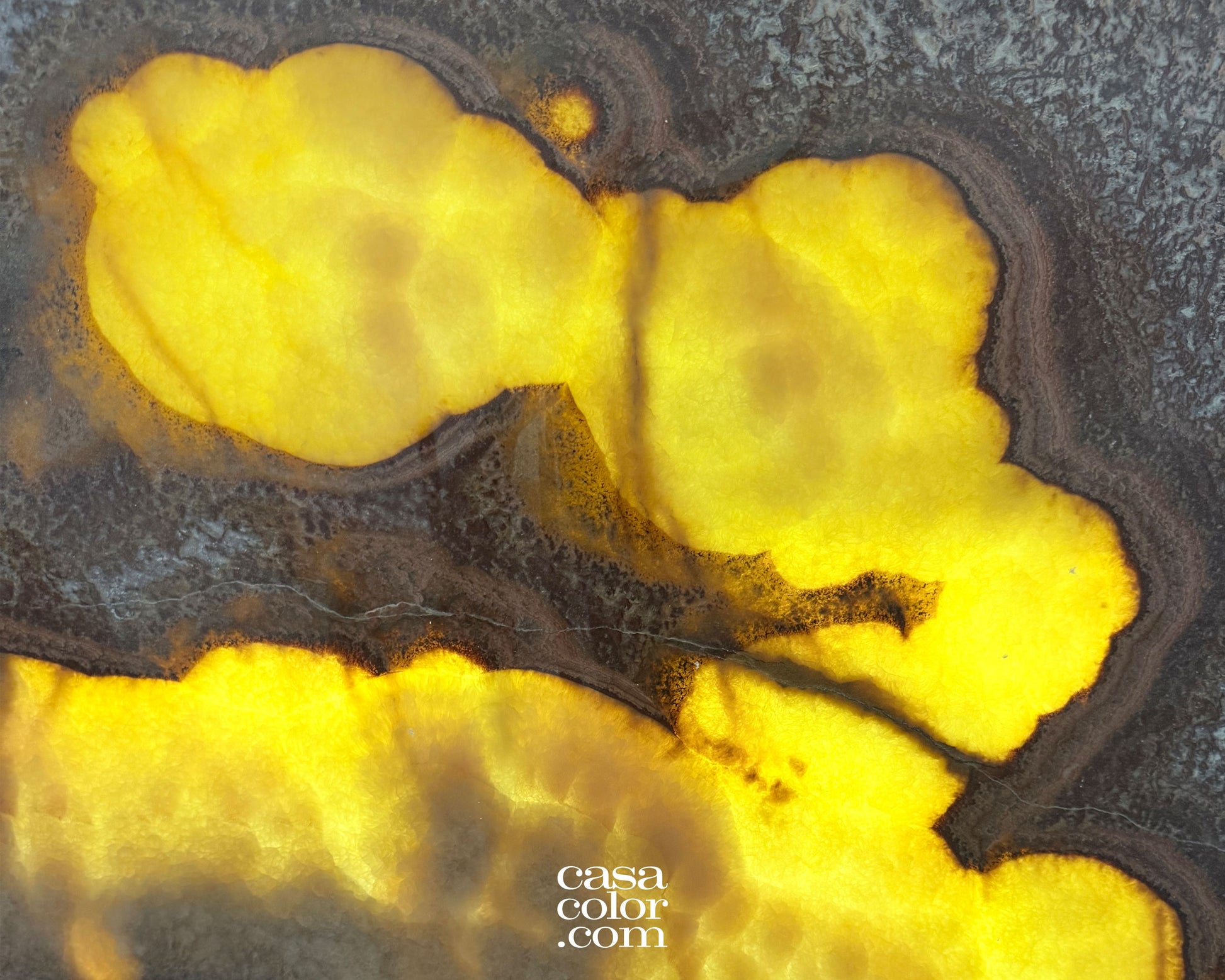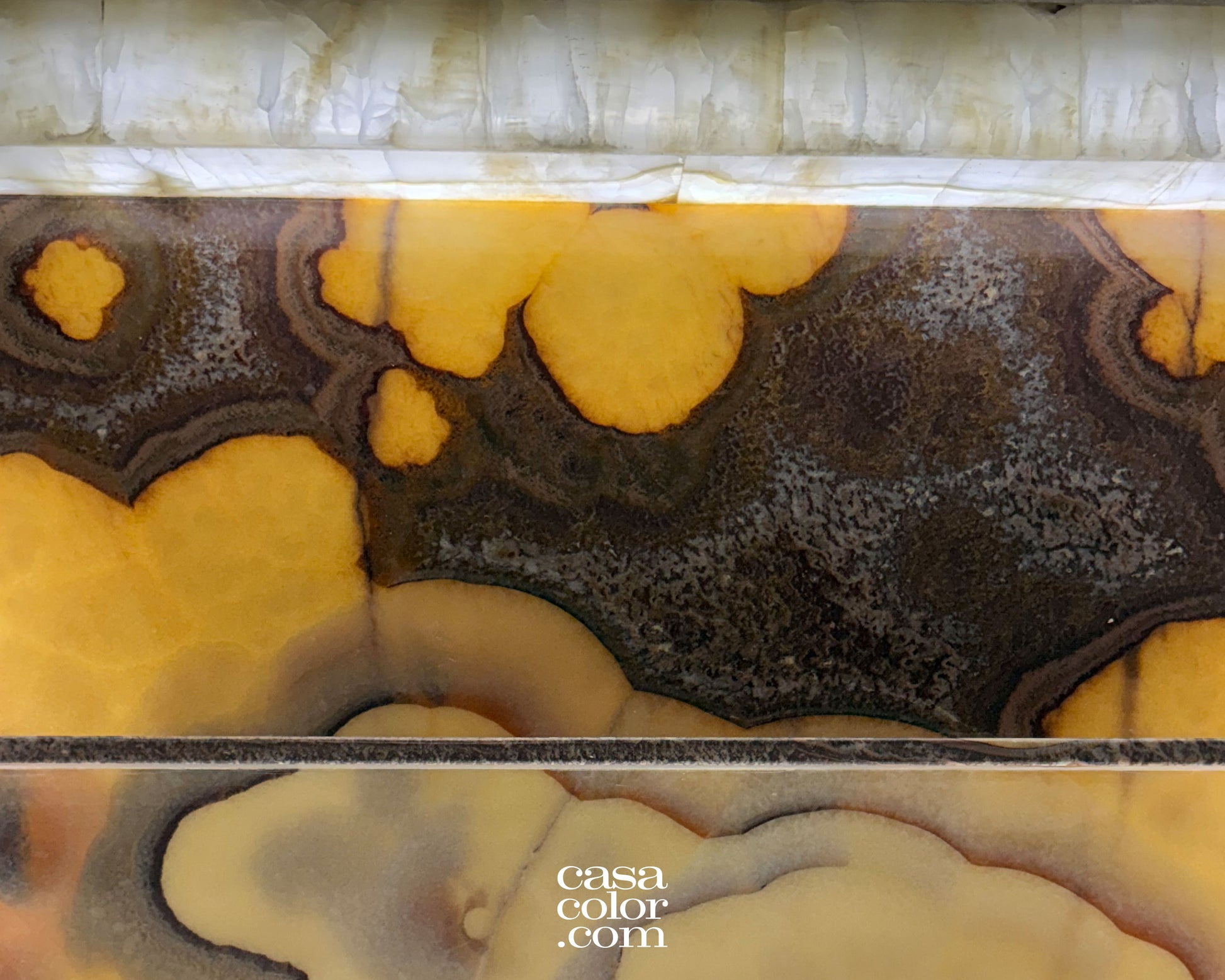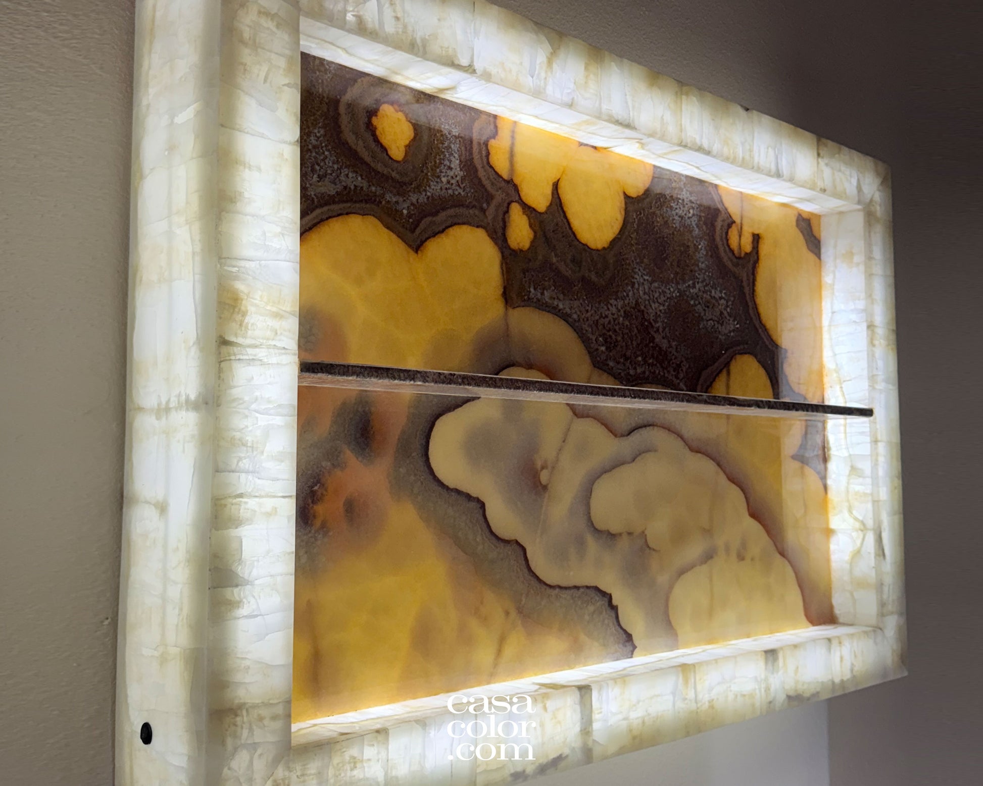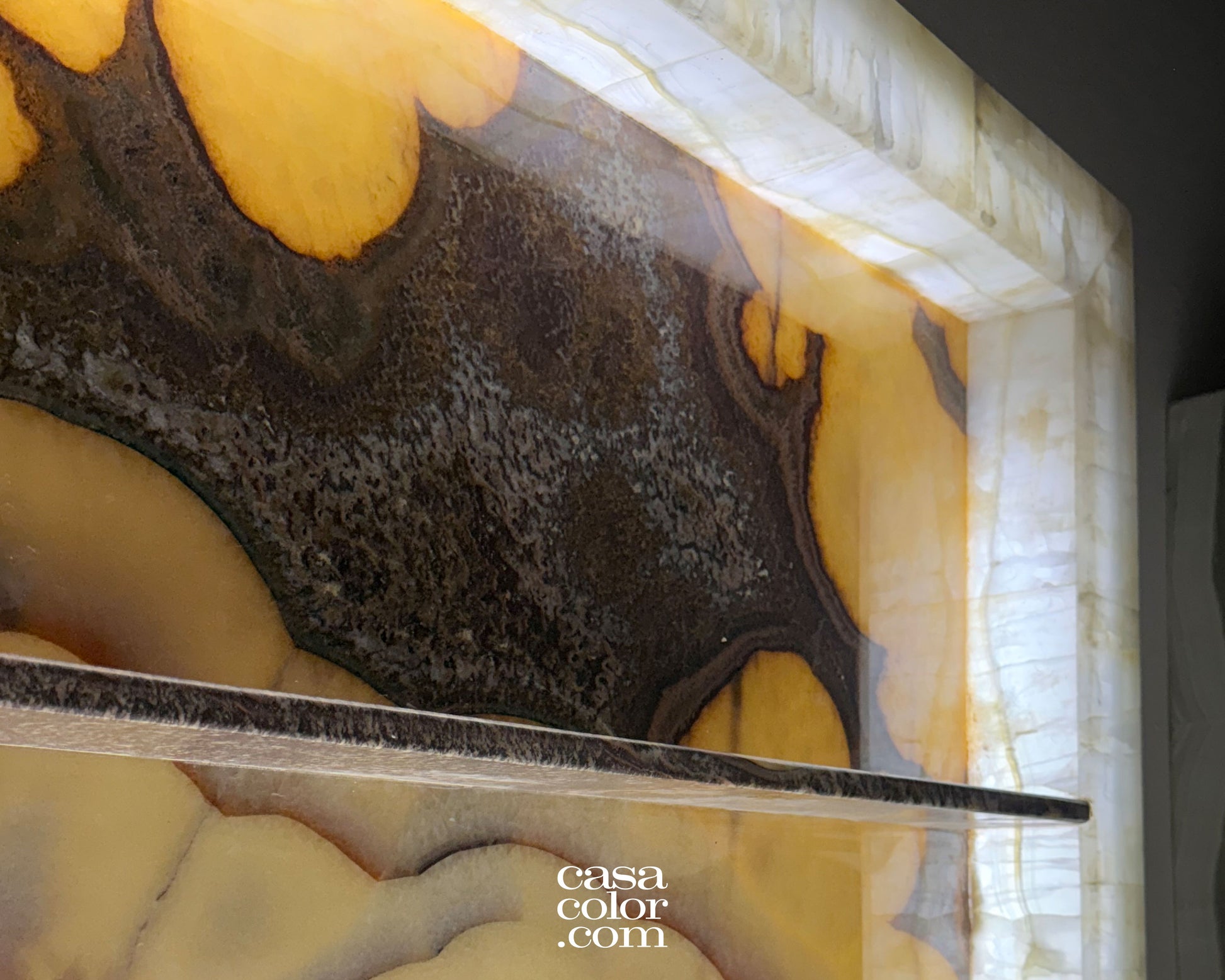 This exquisite LED translucent Vegas-style bar set features a distinctive backlit Onyx design that transforms any environment. Crafted from single slabs of robust onyx with a polished white glossy top, its rich reddish-brown and yellow hues offer a refined aesthetic. Unlike our other bars, this piece stands out for its strength and elegance, making it a captivating centerpiece suited to elevate any home décor style. Prepare to captivate your guests with this exceptional and unique bar.